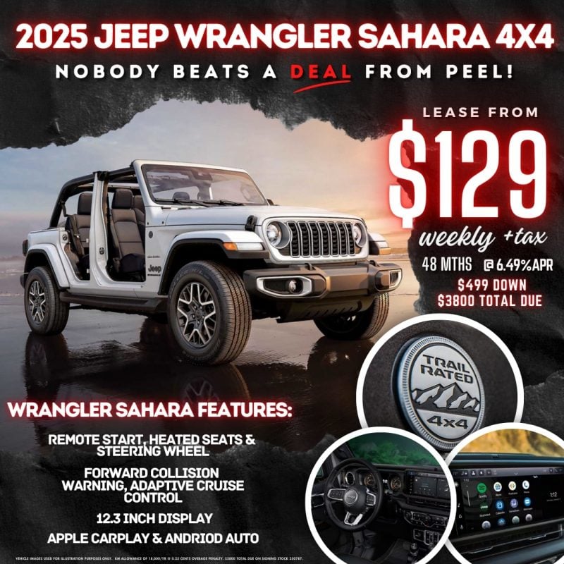 The Jeep Wrangler, the ultimate off-road vehicle that delivers unmatched performance, capability, and style. With its rugged exterior design, powerful engine options, and advanced technology features, the Wrangler is the perfect companion for any adventure. Whether you're hitting the trails, exploring the backcountry, or just cruising around town, the Wrangler is built to handle it all. And with a range of customizable options and trim levels, you can create a Wrangler that's uniquely yours. So why settle for an ordinary SUV when you can experience the thrill of driving the legendary Jeep Wrangler? Visit PEEL CHRYSLER FIAT today to join the Wrangler family!